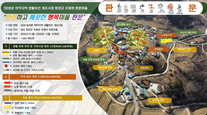 이번에 선정된 2개 마을에는 2026년부터 4년간 국·도비를 포함한 총 34억 원의 사업비가 투입된다. 함양군은 △빈집 정비 △슬레이트 지붕 개량 △마을안길 정비 △혐오시설 철거 △재래식 화장실 정비 등 생활 위생 인프라 정비와 함께 휴먼케어 및 주민 역량 강화도 함께 추진할 계획이다.