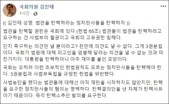 김 의원은 이날 자신의 페이스북에 "법관을 탄핵할 권한은 국회에 있다"면서 "단지 촉구하는 의견만 낼 뿐이라고? 천만에 의견도 낼 수 없다. 그게 3권 분립이다"라고 강조했다.
