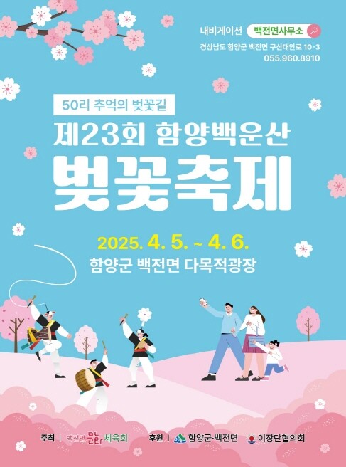 경남 함양군은 4월 5~6일 이틀 동안 백전면사무소 일원에서 '제23회 백운산 벚꽃축제'가 열린다고 24일 밝혔다.