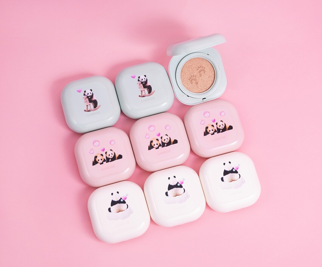 '라네즈X바오패밀리 네오 쿠션'은 매트와 글로우 쿠션 2종을 3가지 색상(21C, 21N, 23N)으로 선보인다. 민트색 매트 쿠션에는 목마를 탄 푸바오의 어린 시절 모습을, 핑크색 글로우 쿠션에는 쌍둥이 아기 판다(루이&후이)를 담았다. '라네즈X바오패밀리 네오 에센셜 블러링 피니시 파우더'에는 아이바오의 뒷모습을 프린팅해 넣었다.