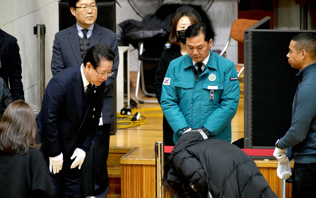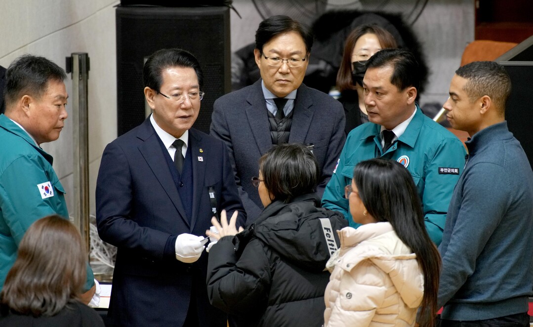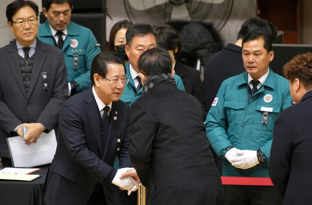 | ▲ 31일 김영록 전라남도지사가 무안스포츠파크에 마련된 제주항공 여객기 추락사고 희생자 합동분향소에서 희생자를 애도하기 위해 찾아온 조문객을 맞이하고 있다. [전남도 제공] |
