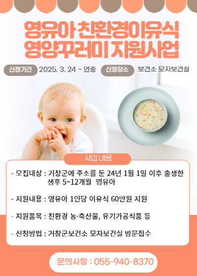 경남 거창군은 24일부터 '2025년 영유아 친환경 이유식 영양꾸러미 지원사업'의 대상자를 모집한다.