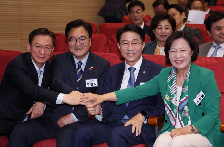 | ▲ 더불어민주당 추미애(오른쪽부터), 조정식, 우원식, 정성호 국회의장 후보가 지난 3일 국회 의원회관에서 열린 원내대표 선출 당선인 총회에서 함께 손을 모아 사진 촬영을 하고 있다. [뉴시스] |