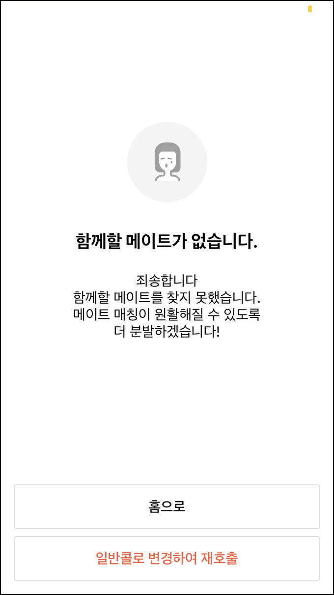 "죄송합니다. 함께 할 메이트를 찾지 못했습니다"
