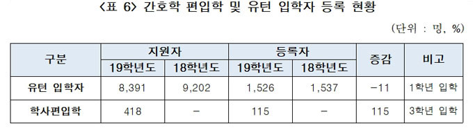 앞서 정부는 지난해 10월 고등교육법 시행령을 개정해 2019학년부터 2023학년도까지 한시적으로 4년 과정으로 간호학과를 운영하는 전문대에 정원 외로 입학정원의 30%까지 편입생을 받을 수 있도록 했다.