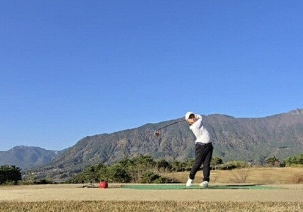 ▲ '골프 꿈나무' 강좌 참가 어린이가 거창CC에서 티샷을 하고 있는 모습 [거창군 제공]