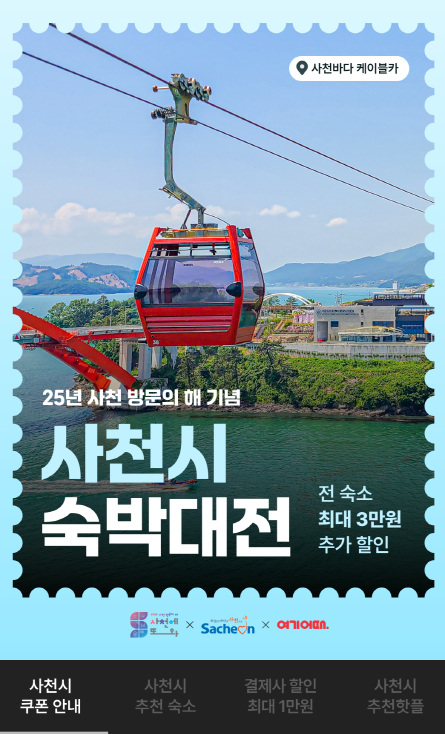 시는 이번 숙박대전을 통해 한국관광 100선에 선정된 사천바다 케이블카, 아라마루 아쿠아리움 등 주요 관광명소를 적극 홍보할 방침이다.