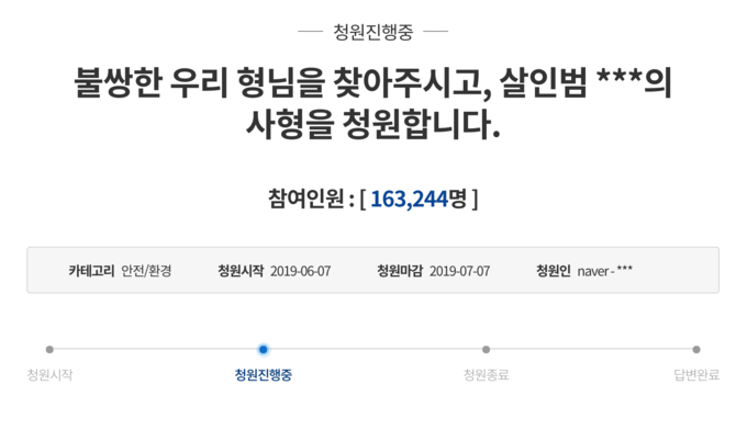 지난 7일 '불쌍한 우리 형님을 찾아주시고, 살인범 ***의 사형을 청원합니다.'라는 제목으로 올라온 청원에는 17일 오후 1시 30분 기준 16만3244명이 동의했다.