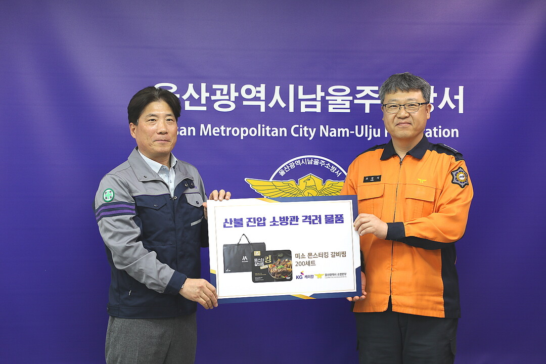 이번에 전달된 감사 물품은 KG F&B 대표 간편식 '미소 몬스터킹 갈비찜' 세트로, 경북·경남·울산 등 산불 현장에 총동원된 33개 소방서 소방관들(2100명)에 일일이 제공된다.