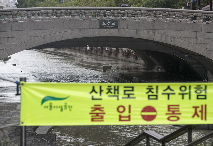 ▲ 서울·경기 일부지역에 호우경보가 내려진 26일 오전 서울 중구 청계천 산책로 입구에 출입통제 안내문이 걸려있다. [정병혁 기자]
