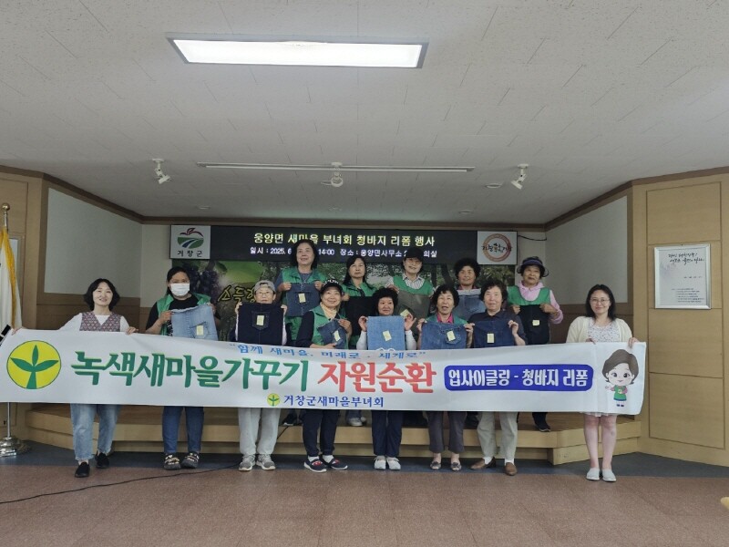 | ▲ 웅양면 새마을부녀회 회원들이 청바지 리폼수업을 하며 기념촬영을 하고 있다. [거창군 제공] |