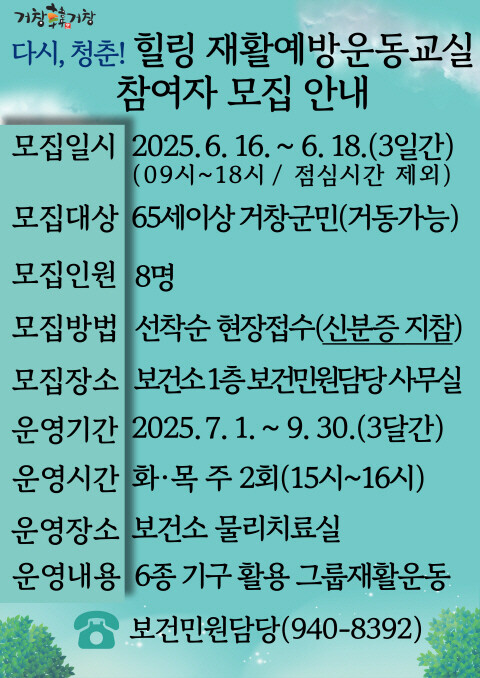 거창군은 16일부터 18일까지 '청춘 힐링 재활예방운동교실' 참여자를 모집한다.