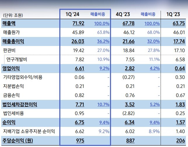 전년 동기와 비교하면 매출은 12.8%, 영업이익은 931.9% 늘었다. 전분기와 비교해 매출 6%, 영업이익은 133.9% 증가했다.