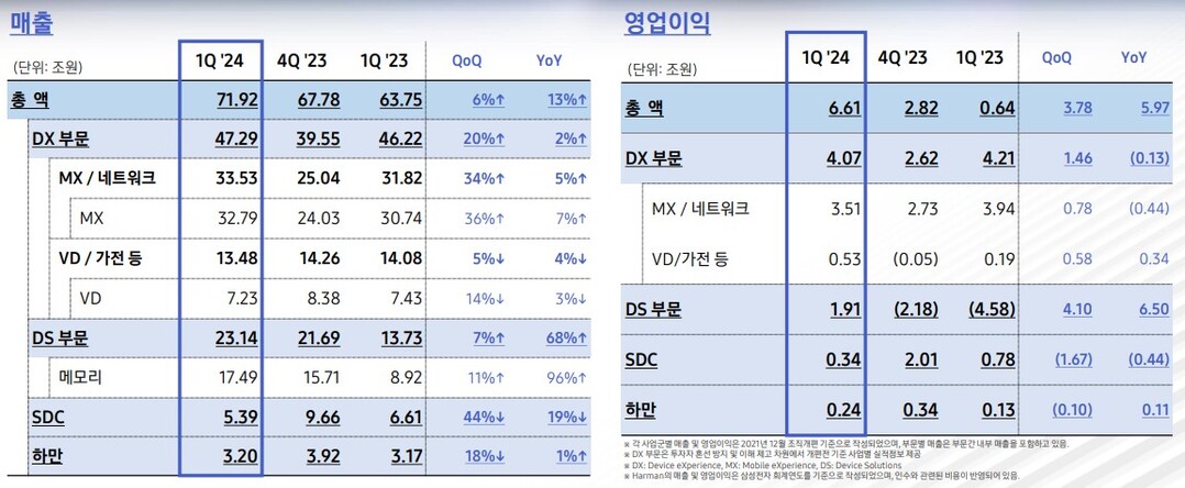 ▲ 삼성전자 2024년 1분기 매출과 영업이익 요약 [삼성전자 1분기 경영설명회 자료 캡처]
