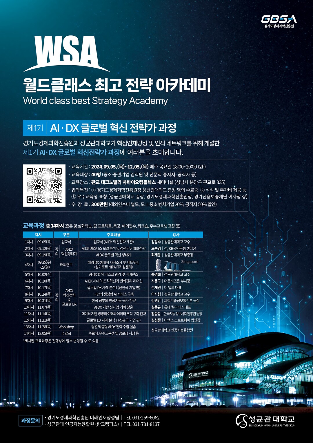 경기도경제과학진흥원(GBSA)은 성균관대학교와 함께 월드클래스 최고전략 아카데미 'AI·DX 글로벌 혁신 전략가 과정'을 개설해 운영한다고 21일 밝혔다.