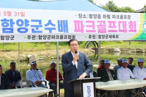 ▲ 진병영 군수가 5월 31일 파크골프대회 개막식에서 인사말을 하고 있다. [함양군 제공]