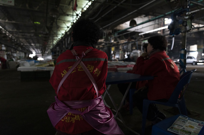 ▲ 노량진 구 시장에 대한 7차 명도집행이 실시된 27일, 집행인력과 상인 간 격렬한 대치 끝에 상인 2명이 병원에 실려 갔다. 사진은 단전·단수가 단행된 지난해 11월 6일 오후 서울 동작구 노량진 구 수산시장 [문재원 기자]