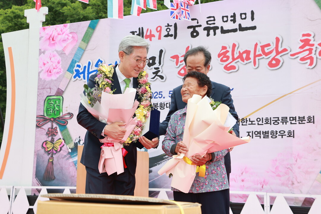 ▲ 25일 궁류면민 체육대회에서 유족 배병순 할머니가 오태완 군수에게 감사패와 꽃다발을 전달하며 환하게 웃고 있다. [의령군 제공]