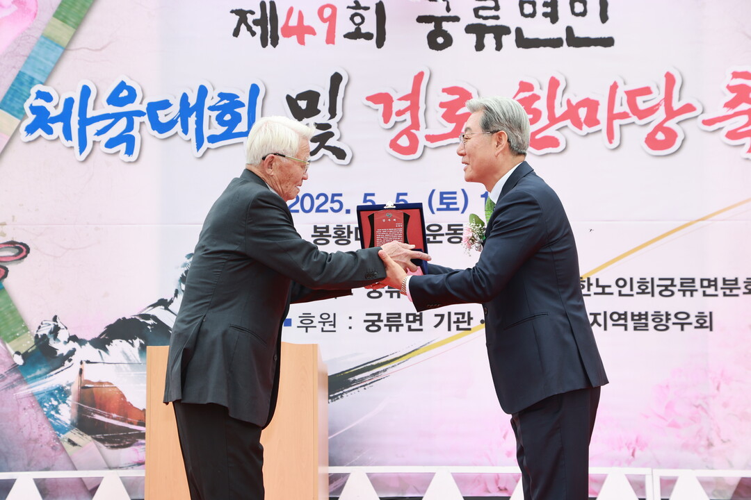 ▲ 지난 5일 궁류면민 체육대회에서 박상출 궁류면 노인회장이 오태완 군수에 감사패를 전달하고 있다.[의령군 제공]