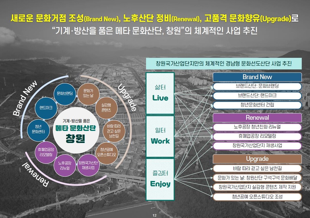 창원시는 이를 실현하기 위해 새로운 문화거점 조성(Brand New), 노후산단 정비(Renewal), 고품격 문화향유(Upgrade)라는 세 가지 전략을 바탕으로 사업을 추진한다.