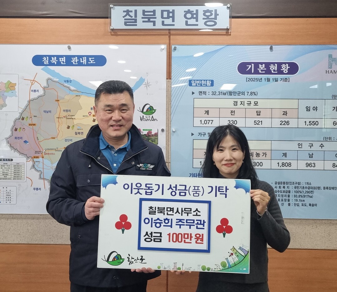 함안군 칠북면사무소에 근무하는 이승희 주무관이 칠북면에 이웃돕기 성금 100만 원을 기탁하면서 명절을 앞두고 훈훈한 나눔 분위기를 이어가고 있다. 이날 기탁된 성금은 경남사회복지공동모금회를 통해 칠북면 어려운 가구에 전달될 예정이다.