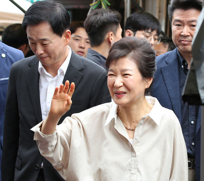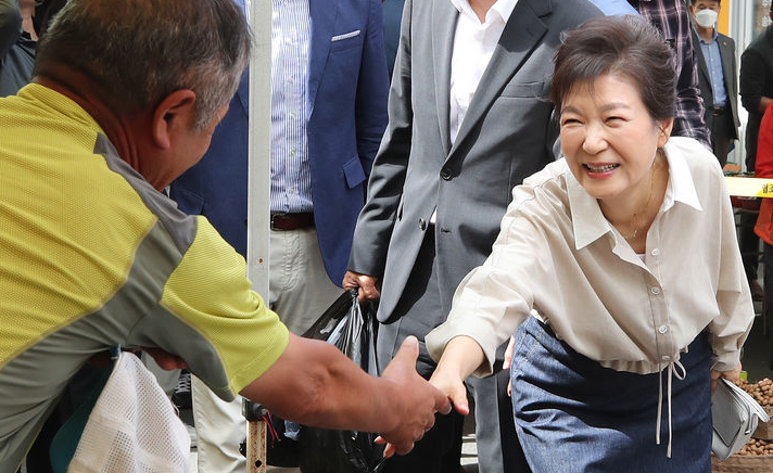 | ▲ 박근혜 전 대통령이 지난 25일 대구 달성군 현풍백년도깨비시장을 찾아 환하게 웃으며 시민에게 손을 흔들고 있다. [뉴시스] |