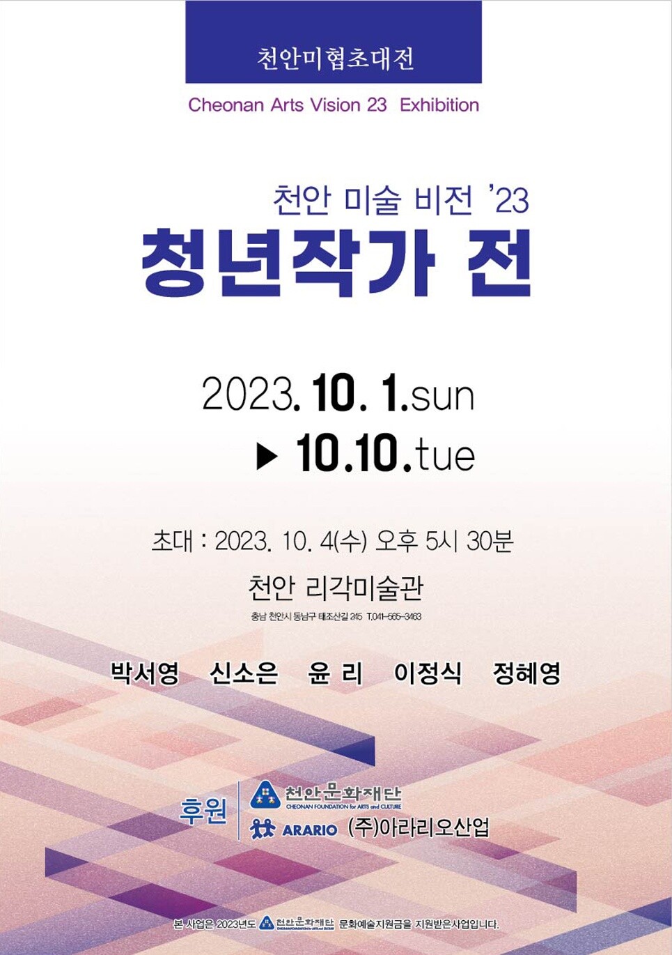 차세대 미술계를 이끌 5인의 유망 작가가 참여하는 ‘천안 미술비전 23 청년작가전’이 열흘간 일정으로 10월 1일 천안 리각미술관에서 열린다.