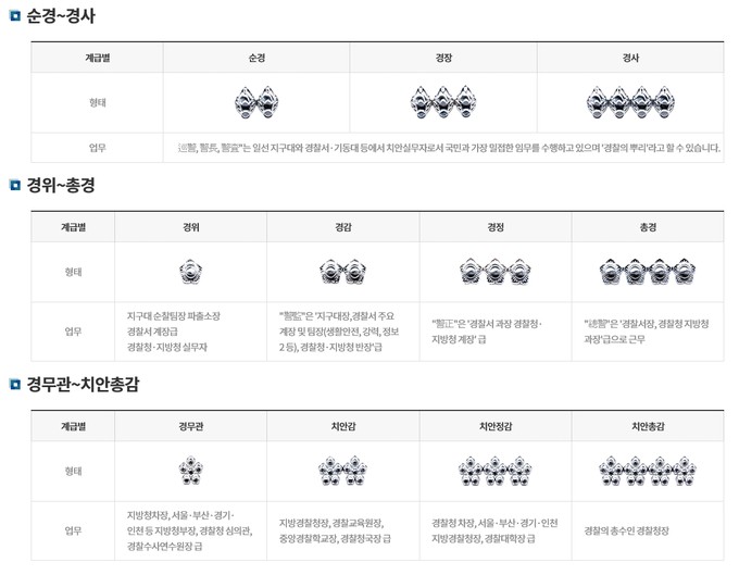 경찰 계급은 총 11개로 나뉜다. 가장 아래부터 위로 순경, 경장, 경사 순으로 태극장 위에 무궁화 잎 두 개로 싸여있는 무궁화 봉오리 표식으로 구분된다. 봉오리 2개가 순경, 3개가 경장, 4개가 경사다. 순경 아래엔 봉오리 1개를 달고 있는 의무경찰이 있다.