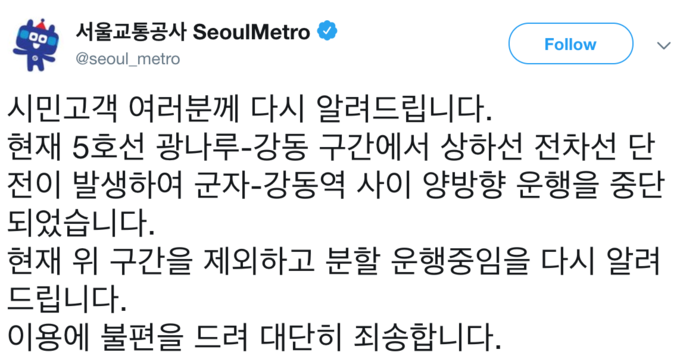 18일 오전 서울 지하철 5호선 강동역~군자역 사이 전차선 단전으로 이 구간 양방향 열차 운행이 중단되는 사고가 발생했다.