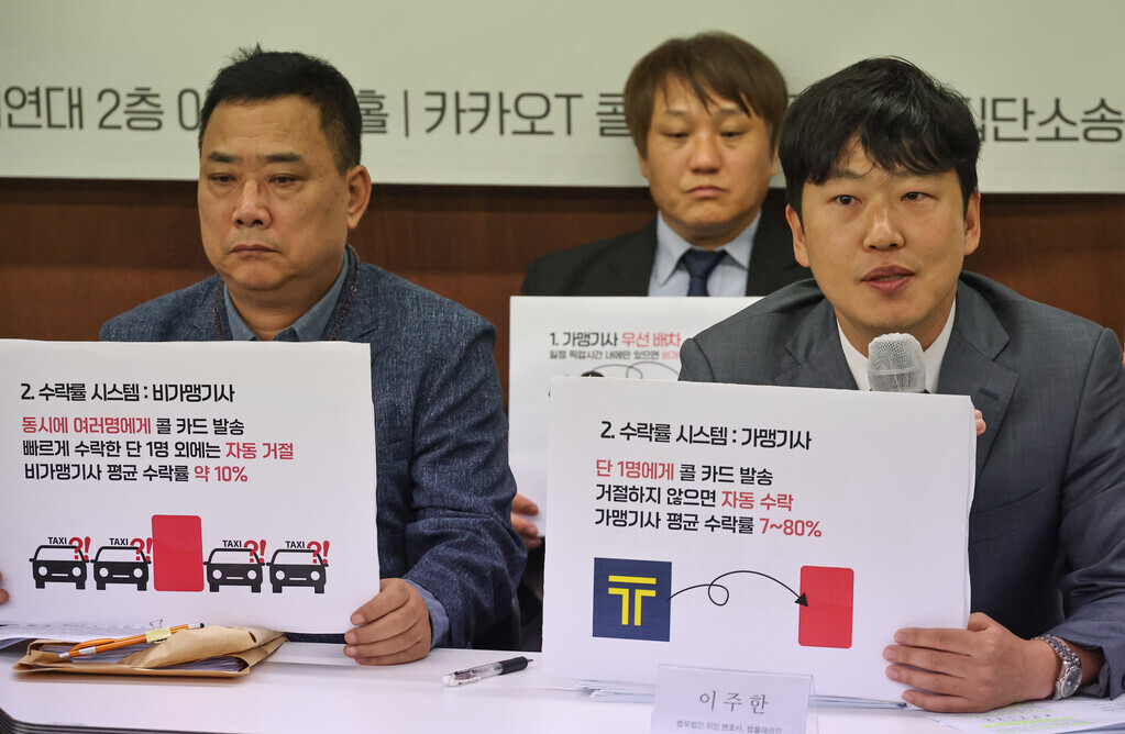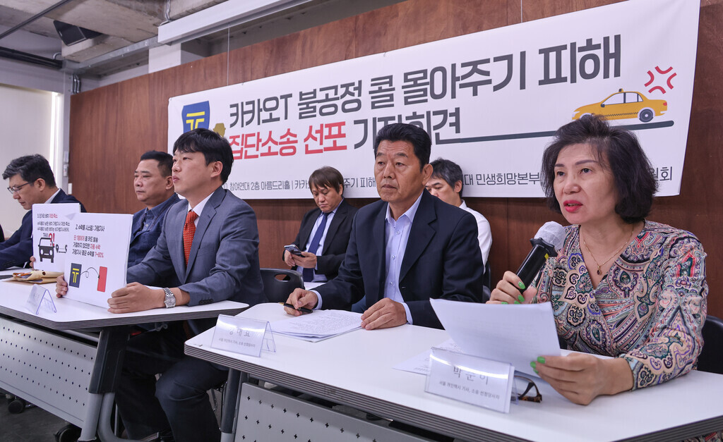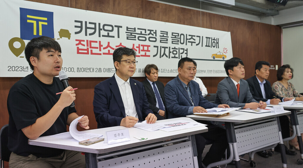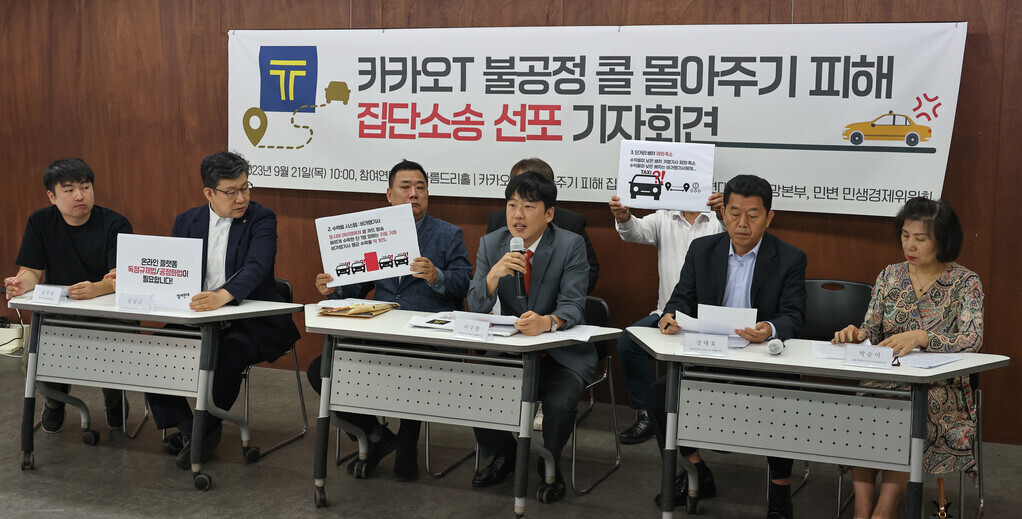 택시 호출 애플리케이션 카카오T를 운영하는 카카오 모빌리티의 호출(콜) 몰아주기로 피해를 입은 당사자인 개인택시 기사들이 21일 오전 서울 종로 참여연대에서 집단소송 선포 기자회견을 열었다.