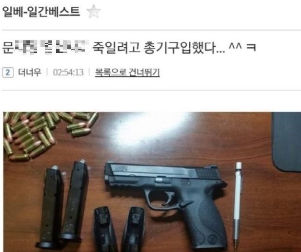 지난 3일 오전 2시54분께 일베에 '문XX XXXX, 죽일려고 총기구입했다'는 제목의 글과 함께 권총, 총탄 사진이 올라왔다.