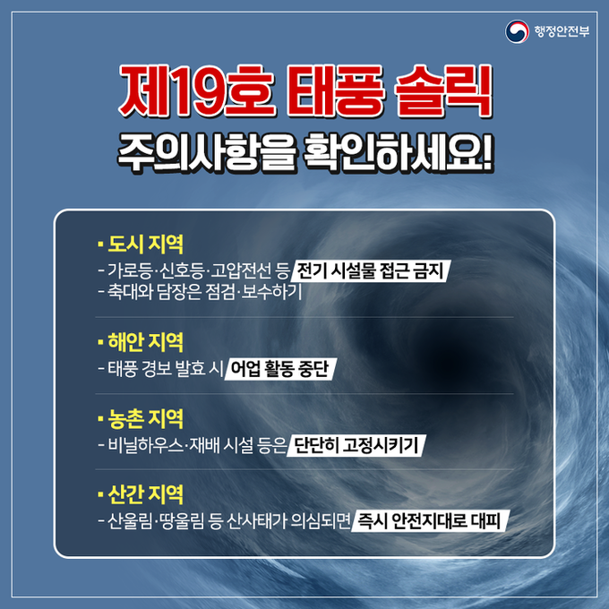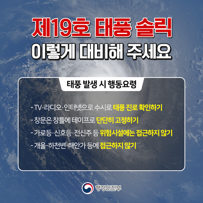 태풍 '솔릭'이 제주도와 남부지방을 시작으로 한반도에 강한 비바람을 몰고 오고 있는 가운데, 행정안전부가 태풍 대비 요령을 공개했다.
