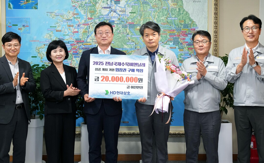 | ▲ 명창환 전라남도 행정부지사가 22일 도청 행정부지사 집무실에서 HD현대삼호와 20백만 원 상당의 2025 전남국제수묵비엔날레 입장권 구매 약정식을 갖은 뒤 기념촬영을 하고 있다. [전남도 제공] |