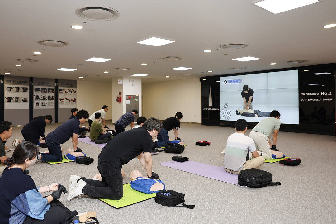 지난 5월 롯데물산 소방방재팀 소속 직원 6명을 '대한심폐소생협회 일반인 심폐소생술 강사'로 양성했고 자체 교육을 수행하는데 필요한 시설, 장비 등의 제반 역량도 갖췄다고 한다. 전문 강사의 심폐소생술 이론과 가슴압박 실습, 자동심장충격기(AED) 사용법 등 실제 상황에서 대처 능력을 키우기 위해 체험과 실습 방식으로 교육을 진행하고 있다.