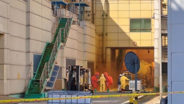 ▲ 9일 오전 8시 55분께 전북 군산시 OCI 공장에서 화학물질이 누출돼 소방 당국이 중화 작업을 하고 있다. [전북소방본부 제공]