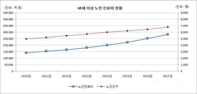 노인진료비는 28조3247억원으로 2016년 25조2692억원보다 3조555억원(12.1%) 증가했다. 2010년 14조1350억원에 비해 2배 많은 금액을 진료비로 지출했다. 전년 대비 증가율은 2014년 10.4%, 2015년 11.4%, 2016년 13.6%, 지난해 12.1% 등으로 두 자릿수를 기록했다.