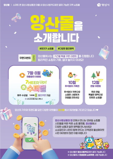 양산사랑카드를 사용하는 고객들은 '양산몰'에서 2만 원 이상 구매 시 7000원의 할인쿠폰을 사용할 수 있다. 이 쿠폰은 8월 말까지 매주 수요일마다 지급된다.
