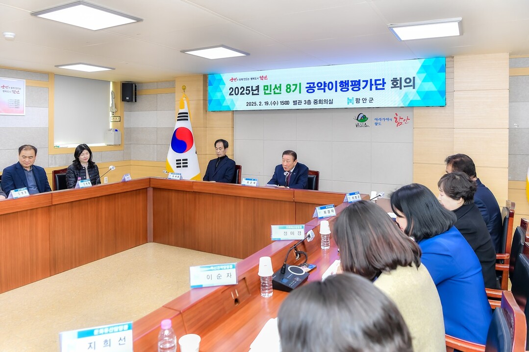 경남 함안군은 19일 군청에서 오세율 평가단장과 공약이행평가단 위원, 공약사업 주관부서장 등 32명이 참석한 가운데 '2025년 민선8기 공약이행평가단' 회의를 개최했다.