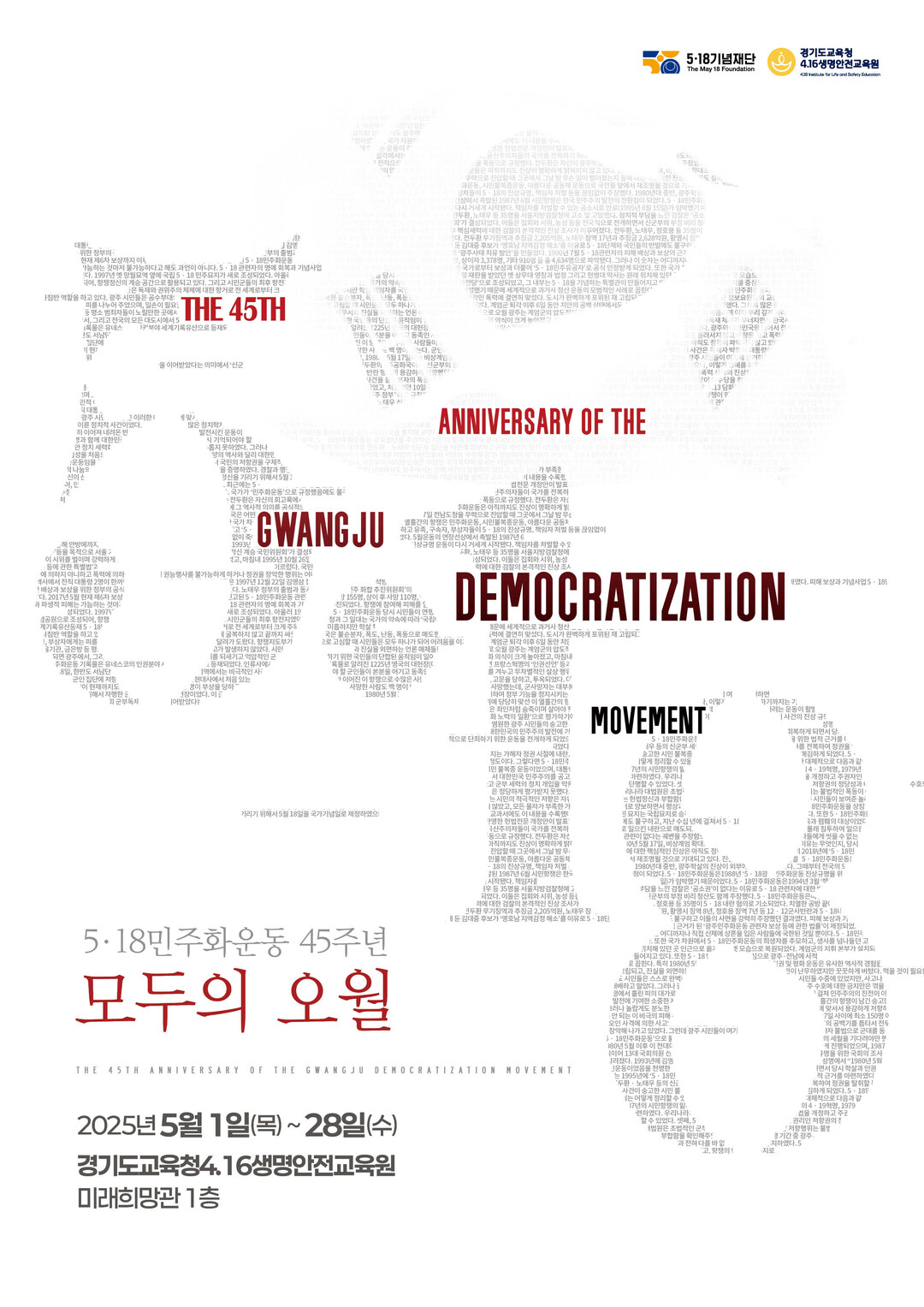 이번 전시는 5·18기념재단과 협력 기획 사업으로 진행되며, 1일부터 28일까지 경기도교육청4·16생명안전교육원 미래희망관 1층에서 열린다.