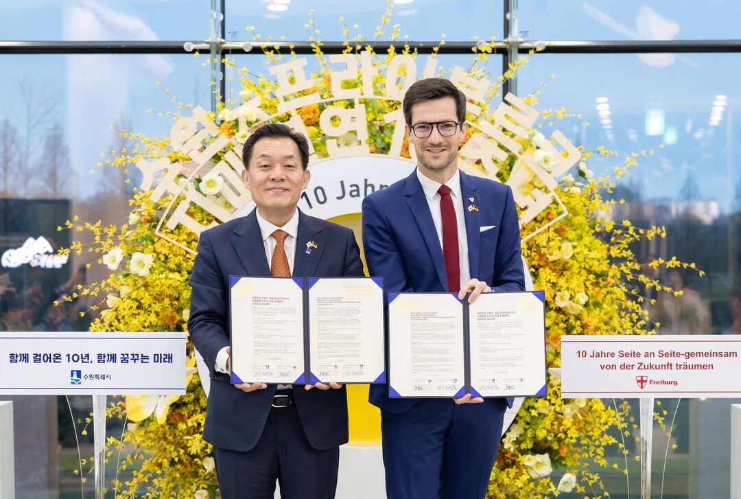 이재준 수원시장은 "10년 전 수원과 프라이부르크는 '지속 가능한 미래 환경 도시'라는 공동의 비전을 바탕으로 친구가 됐다"며 "우리는 오랜 우정을 바탕으로 더 좋은 도시를 만들어왔다"고 말했다.