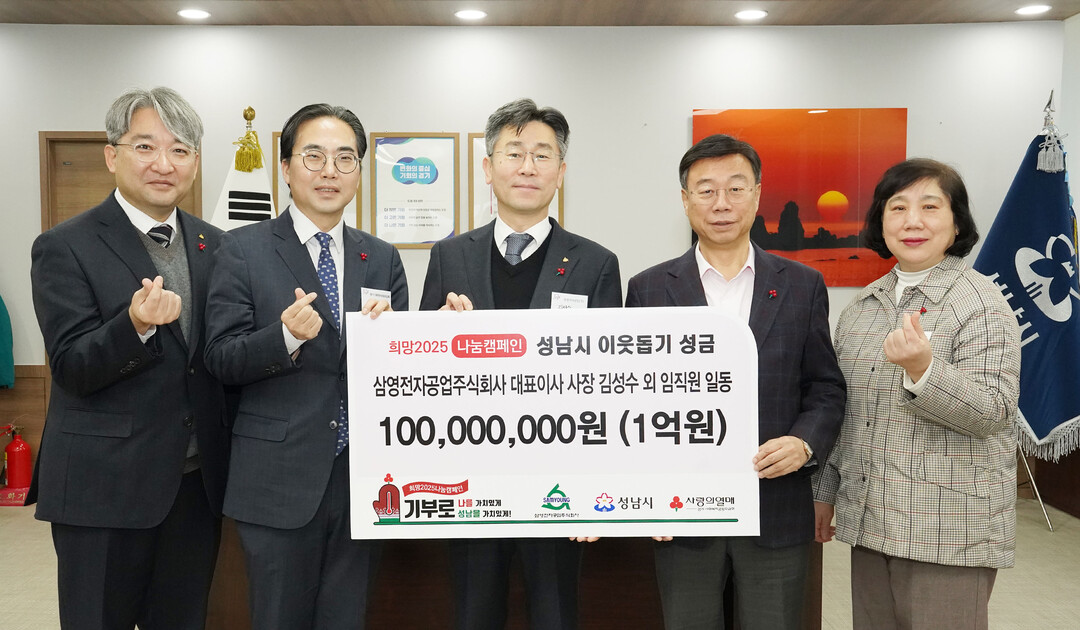 13일 성남시에 따르면 이날 오전 시장 집무실에서 신상진 성남시장과 김성수 삼영전자공업㈜ 대표이사 사장 등이 참석한 가운데 이웃돕기 성금 기탁식을 가졌다.