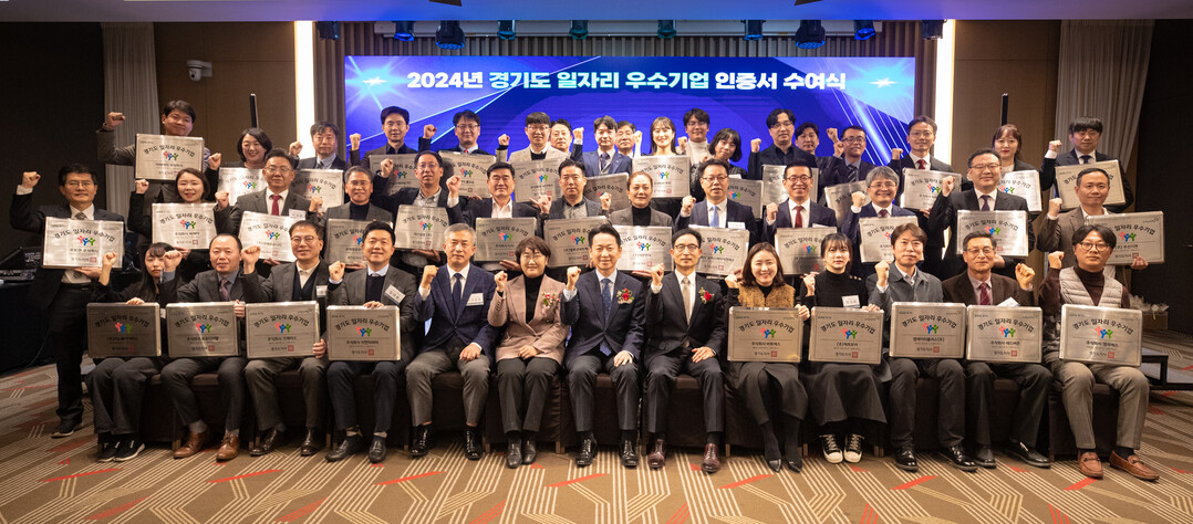 경기도는 19일 수원 코트야드 메리어트 호텔에서 고영인 경기도 경제부지사, 고은정 경기도의회 경제노동위원회 위원장, 윤덕룡 경기도일자리재단 대표이사가 참석한 가운데 '2024년 경기도 일자리 우수기업 인증서 수여식'을 갖고, 신규 인증 받은 일자리 우수기업 50개 사와 청년 일하기 좋은 기업 10개 사에 인증서와 현판을 전달했다.