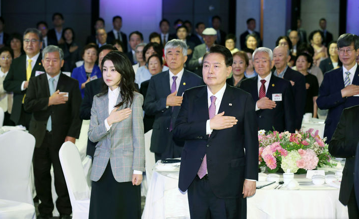 | ▲ 윤석열 대통령과 부인 김건희 여사가 4일 서울 광진구 그랜드 워커힐 서울에서 열린 파독 근로 60주년 기념 오찬에서 국기에 대한 경례를 하고 있다. [뉴시스] |