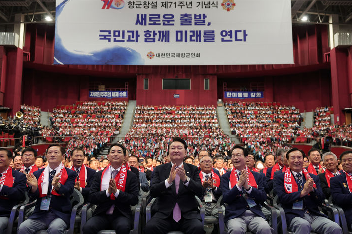 | ▲ 윤석열 대통령이 4일 서울 송파구 올림픽공원 올림픽홀에서 열린 향군 창설 제71주년 기념식 및 전국 읍·면·동회장 총력안보 결의대회에서 손뼉을 치고 있다. [대통령실 제공] |