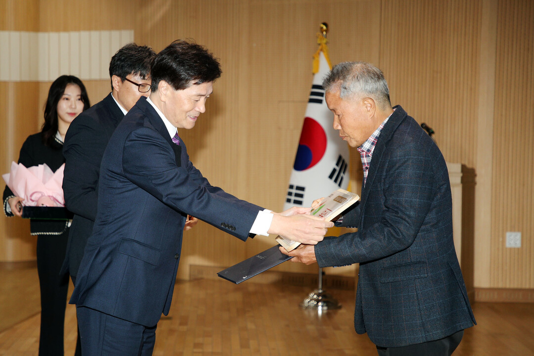 안병구 시장은 이날 시청 대강당에서 열린 3월 직원 소통의 날(옛 정례조회)에서 화산마을 박성오 이장에게 표창장 및 현판을 전달했다.