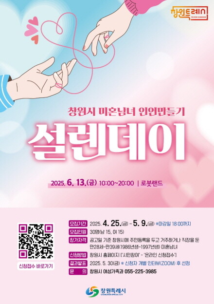경남 창원특례시는 미혼남녀 인연만들기 '설렌데이' 참가자 모집을 마감한 결과, 남성의 경우 12대 1 경쟁률을 기록하는 호응을 얻었다고 12일 밝혔다.