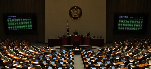 ▲ 5일 서울 여의도 국회에서 열린 제367회국회(임시회) 제10차 본회의에서 국회법 일부개정법률안이 찬성 237, 반대 3, 기권 12로 통과되고 있다. [뉴시스]