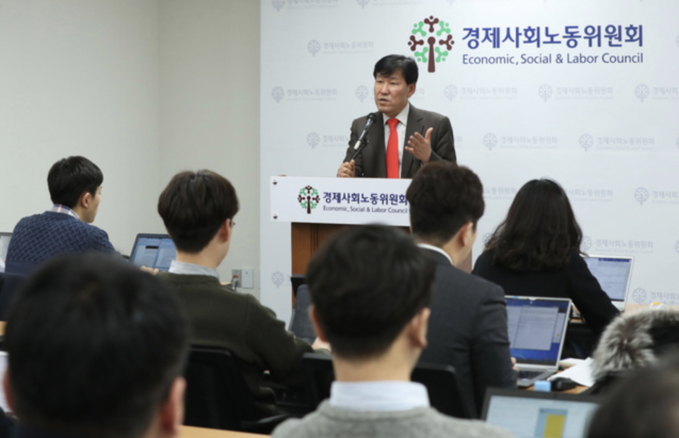 ▲ 이철수 노동시간제도개선위원회 위원장이 19일 오전 서울 종로구 경제사회노동위원회에서 탄력근로제 확대 적용 문제에 대한 제8차 전체회의 논의 결과를 발표하고 있다. [뉴시스]