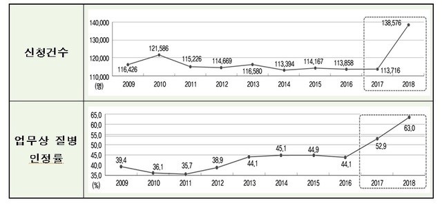 업무상 질병 인정 비율은 2016년까지 30∼40%대에 머물렀으나 현 정부가 출범한 2017년 52.9%로 뛰었고 작년에는 63.0%로 상승했다. 현 정부 들어 업무상 질병을 폭넓게 인정해주는 방향으로 제도를 개선했기 때문인 것으로 풀이된다.