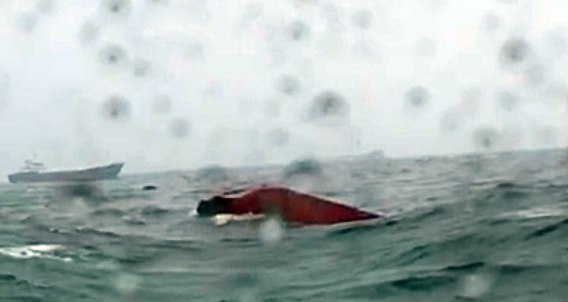 ▲ 27일 부산 앞바다 한가운데서 전복된 배의 일부가 가라 앉은 모습 [부산해경 제공]